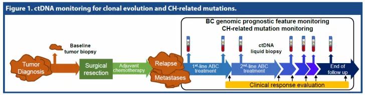 编者按:乳腺癌的复发、转移是影响患者预后的重要因素,与个体的驱动基因相关,也受到治疗压力下肿瘤进展过程中错综复杂的分子机制的影响,在时空两个维度下,获取全面的肿瘤遗传信息对揭示肿瘤复发转移机制具有重要意义。由于晚期患者组织难以取得,肿瘤异质性及复发转移病灶穿刺活检后的有创性,很难全面的捕捉到晚期肿瘤的基因组图谱,ctDNA液体活检能够部分克服这些限制并对患者的分子图谱变化进行全程跟踪。另外,克隆性造血突变是近年来的研究热点之一,是指成年后克隆性造血干细胞的异常改变而导致白血病相关非恶性体细胞突变的产生,可由健康人群携带。目前对于晚期乳腺癌的分子机制及克隆性造血相关突变与患者预后之间的关联尚未见有大规模的研究。