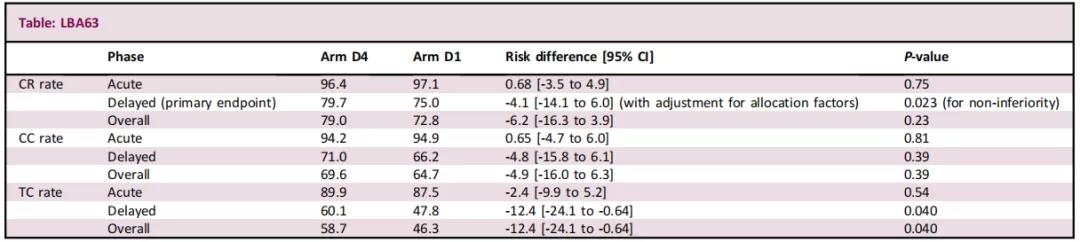 结果:2018年10月至2021年3月期间,共入组了281例患者,其中274例患者可评估。基线特征平衡良好。CR、CC和TC如下表所示,D4组和D2组的延迟期CR率分别为79.7%和75.0%,非劣效性具有统计学意义(P=0.023)。