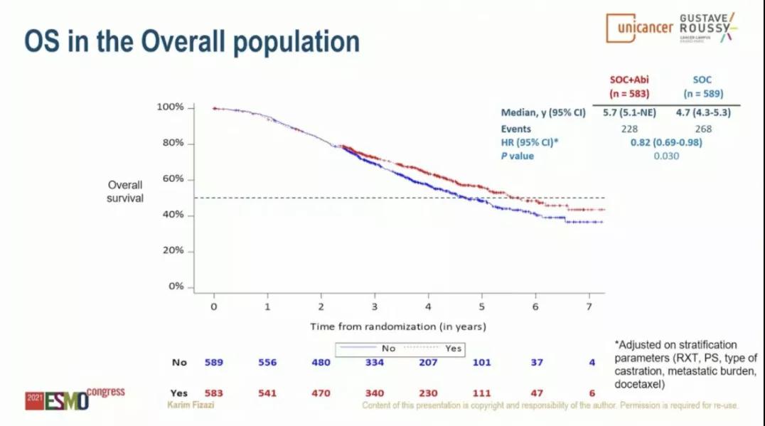 结果:中位随访时间为4.4年(ADT+多西他赛人群中有273例死亡事件)。阿比特龙对OS的影响与RXT对OS的影响没有相互作用(P=0.82)。因此,可以将阿比特龙组进行汇总比较。在总体人群(SOC为ADT或ADT+多西他赛)中,联合阿比特龙可显著改善OS(5.7 vs 4.7年;HR 0.83,95%CI:0.69~0.99,P=0.034);在ADT+多西他赛人群中,联合阿比特龙同样可显著改善OS(NR vs 4.4年;HR 0.75,95%CI:0.59~0.96,P=0.021)。