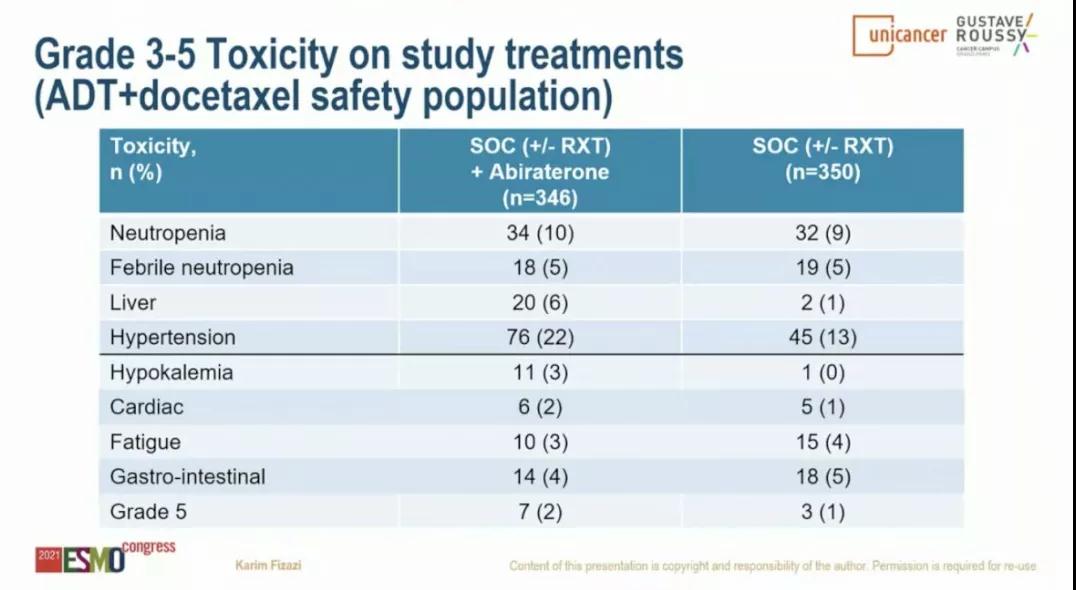 在发展为CRPC的患者中,ADT+多西他赛组中有231/263(88%)接受至少一次ASI治疗,对照组中有222/263例(84%)接受至少一次ASI治疗,而阿比特龙组分别为110/141例(78%)和67/141例(48%)。ADT+多西他赛人群中>5%的3-5级不良事件(阿比特龙组 vs 对照组)主要为:中性粒细胞减少症发热(5% vs 5%)、中性粒细胞减少症(10% vs 9%)、肝毒性(6% vs 1%)和高血压(21% vs 13%)。