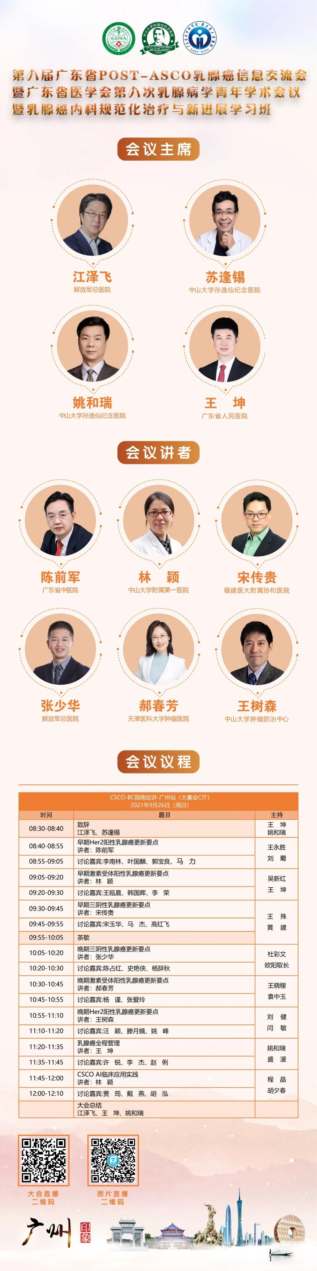 2021年9月26日(明日)8:30-12:10,在第八届广东省POST-ASCO乳腺癌信息交流会暨广东省医学会第八次乳腺学青年学术会议暨乳腺癌内科规范化治疗与新进展学习班大会中,CSCO-BC指南巡讲-广州站正式开始。会议由中国人民解放军总医院江泽飞教授、中山大学孙逸仙纪念医院苏逢锡教授、广东省人民医院王坤教授、中山大学孙逸仙纪念医院姚和瑞教授担任主席,广东省中医院陈前军教授、中山大学附属第一医院林颖教授、福建医科大学附属协和医院宋传贵教授、解放军总医院张少华教授、天津医科大学肿瘤医院郝春芳教授、中山大学肿瘤防治中心王树森教授从不同分子亚型、不同分期的乳腺癌指南更新要点出发解读指南、普及规范,更有诸多领域内专家参与讨论,精彩不容错过。