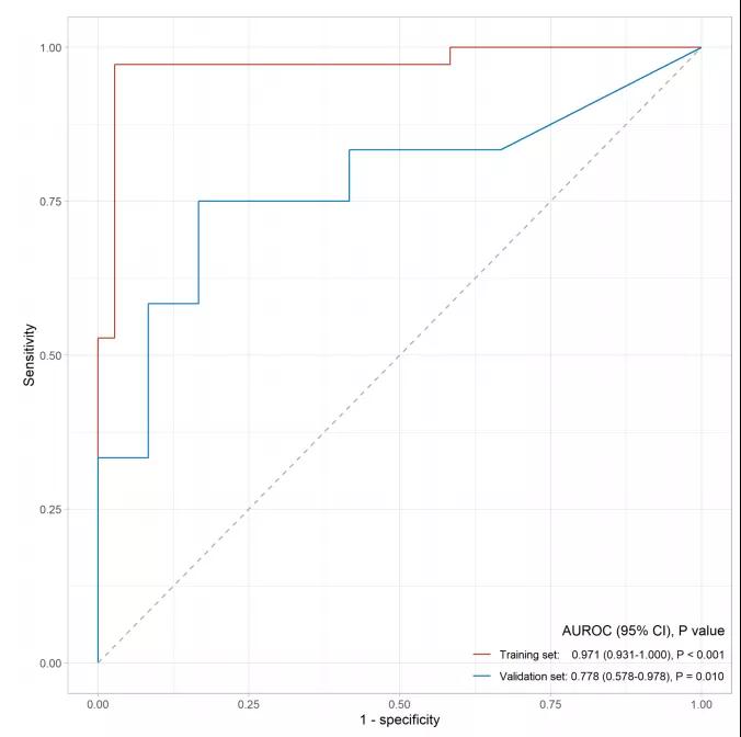本次研究中我们医院实力出色的影像科功不可没,他们此前就开展过应用影像组学特征,预测肝癌患者是否存在微血管癌栓的情况,本次也是由影像科团队从我科收治患者的影像学检查中,提取了约10个影像组学特征,并对仑伐替尼+PD-1抑制剂的疗效进行预测,效果还是比较好的。