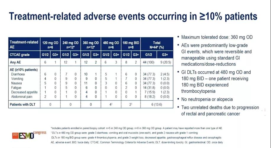 在120mg、240mg、360mg组,最常见的药物不良反应为1-2级恶心、呕吐及腹泻。480mg组,3/6例患者发生剂量限制性毒性(3级腹泻、3级口腔黏膜炎、3级呕吐。180mg 每天口服两次组,1/7例患者出现剂量限制性毒性(4级血小板减少)。240mg与360mg为临床相关剂量,其中360mg为初步推荐的Ⅱ期剂量。在禁食患者中,平均达峰时间1.5~4小时,平均半衰期为75小时,8~15天达稳态血药浓度。增加剂量后,血浆暴露量按比例增加,在整个给药期间,都达到了药理学上的活性暴露。食物对暴露没有临床意义上的明显影响。