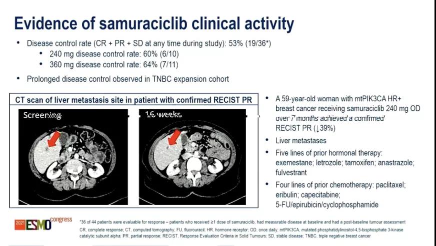Samuraciclib(CT7001)是一种口服有效的选择性CDK7抑制剂,360mg一天一次是最大耐受性剂量,药物不良反应主要为1-2级胃肠道事件,可逆转,可管理。晚期恶性肿瘤患者给药后,持久的疾病稳定甚至缓解,证明了该药良好的抗肿瘤活性。