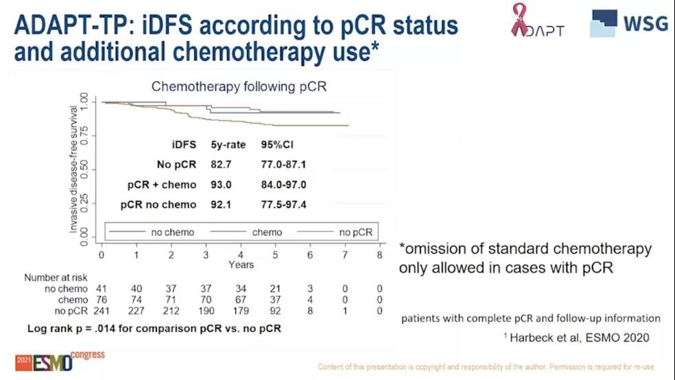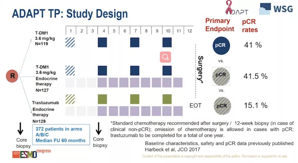 西德研究组的ADAPT系列研究中的ADAPT TP、ADAPT TPⅡ,就是针对三阳性患者进行的新辅助治疗不同治疗方案的尝试,目的在于找到此类患者的最适早期治疗方案,真正鉴别出可以安全豁免化疗的人群。2017年公布的ADAPT TP结果显示,4个周期的T-DM1+/-内分泌治疗(ET)后,pCR率能达到40%,且5年的生存数据很好。本次ESMO大会上,担任试验PI的Nadia Harbeck教授就ADAPT TP研究中接受不同方案、得到不同肿瘤缓解和生存结局者的生物标记物情况做了简短的口头报告。