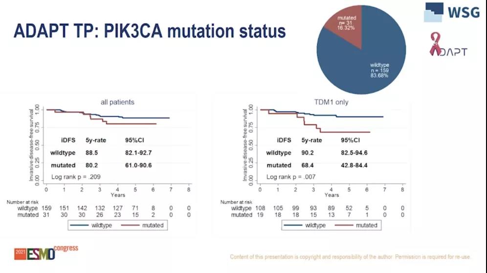 无论新辅助治疗还是进展期乳腺癌中,PIK3CA突变者通常预后不好,尤其在HR+或HER2+者这种现象被认为与曲妥珠单抗治疗或内分泌治疗的耐药性有关。但晚期乳腺癌中,T-DM1的疗效似乎并没有受到携带PIK3CA突变的影响。这给了新辅助治疗中尝试优先使用T-DM1而试图克服曲妥珠单抗原发耐药的理论根据。本次汇报中,Nadia教授特别提到说非常有趣的是,在T-DM1试验组,存在PIK3CA突变者与野生型相比预后差,所以至少在ADAPT研究中,我们并未看到对于早期PIK3CA突变的三阳性患者,T-DM1可以作为一个优先选择的抗HER2靶向药物。