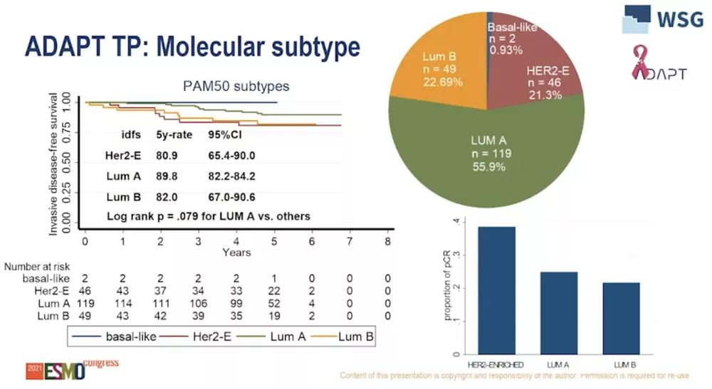 3.与其他亚型相比,占比55%的luminal A亚型患者尽管pCR率仅为25%,但预后并不差(5年iDFS 96% vs 83%;HR 0.50;0.23~-1.08;P=0.079);