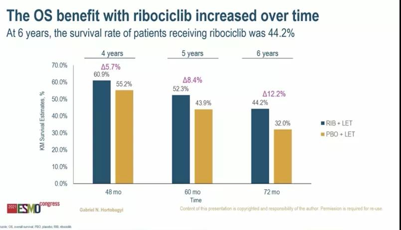 胡夕春教授:2021 ESMO大会为我们带来了很多好消息,所有分子分型的乳腺癌中都均可看到。对于绝经后的HR+/HER2-晚期乳腺癌,MONALEESA-2的总生存期结果公布:中位随访时间为79.7个月,Ribociclib(RIB)联合内分泌治疗组较安慰剂(PBO)联合内分泌治疗组显示出显著的OS获益,两组患者总生存期分别为63.9个月vs 51.4个月(HR=0.76、95%CI:0.63~0.93,P=0.004),RIB组评估的6年OS率为44.2%,PBO组为32.0%。这是我们第一次在晚期乳腺癌中看到中位总生存超过60个月的结果。