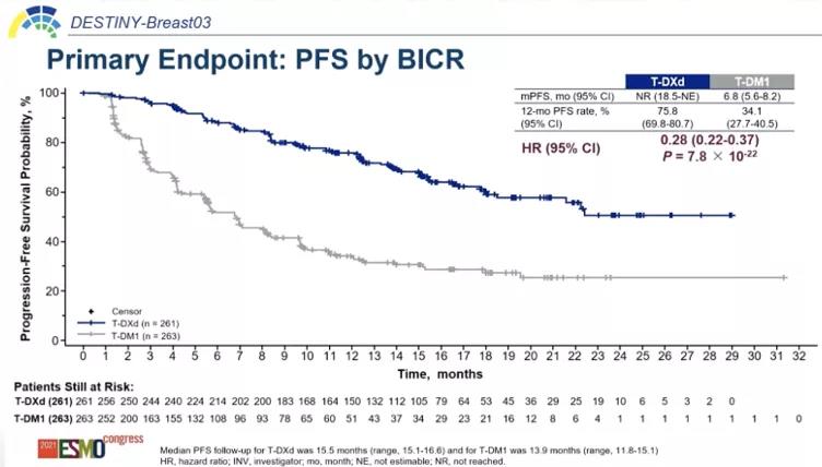 对于HER2+乳腺癌,DESTINY-Breast03研究初步结果公布:DS-8201与T-DM1在二线治疗中进行了头对头比较,中位随访分别为16个月和15个月时,DS-8201组的中位PFS仍为未达到(95% CI:18.5~NE),而T-DM1组的中位PFS为6.8个月(95% CI:5.6~8.2)。两组间PFS具有高度显著的统计学差异(P=7.8×10-22)且具有显著临床意义的改善。我们也从中看到了DS-8201治疗组患者OS获益的趋势。DS-8201真是一个神药,由研究者评估的中位PFS达到了25个月,而且这是在90%以上的二线和二线以上的人群中获得的,已经远远超过了既往一线治疗的最好中位PFS。