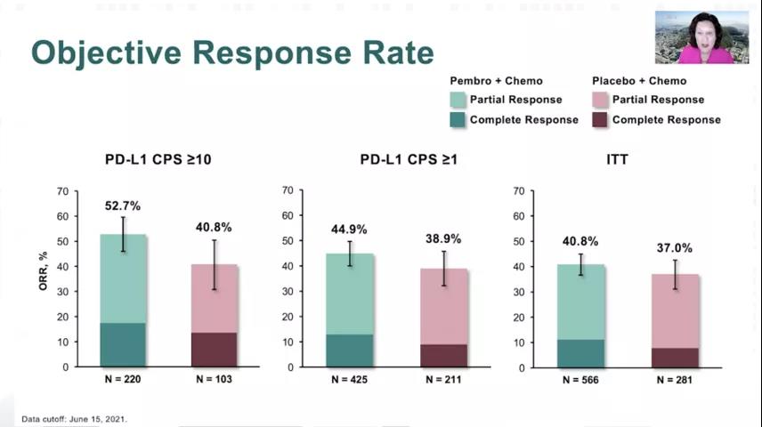 对于三阴性乳腺癌,本次大会KEYNOTE-355研究主要更新了两点。首先是PFS改善:既往研究结果显示,与安慰联合化疗相比,pembrolizumab联合化疗与一线治疗PD-L1阳性(CPS≥10)mTNBC患者的PFS分别为9.7个月和5.6个月(HR=0.65,95%CI:0.49~0.86,P=0.0012)。此次PFS结果与以往获得了显著性获益一致,PD-L1阳性(CPS≥10)mTNBC患者仍在继续获益。pembrolizumab联合化疗改善了CPS≥10 mTNBC患者的ORR。