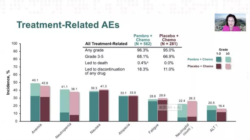 胡夕春教授:总体上来看,pembrolizumab+化疗组和对照组的治疗相关不良事件率相似,而免疫至化疗相关不良事件率较对照组确有上升,但这些不良反应是可以进行处理的;而且随着随访时间的延长,该研究并没有新发的不可预知的不良反应,总体安全性非常好。