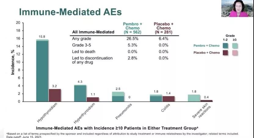 最主要区别是pembrolizumab+化疗组患者免疫相关的不良事件增加,因为PD-1/PD-L1引起的免疫上调不完全针对肿瘤,也会引起其他免疫功能的上调。不良反应有会引起甲状腺功能低下(开始时表现为甲状腺功能亢进),可通过补充甲状腺素片可很容易解决。肺毒性、心毒性发生较少,其他的不良反应,临床上也是可以很好进行处理的。