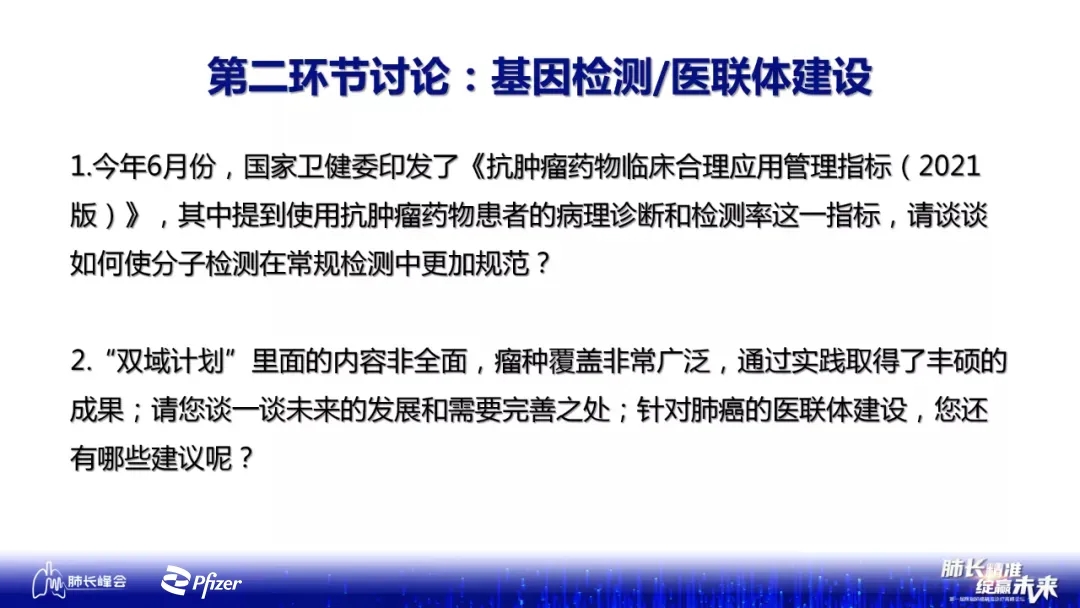 讨论嘉宾也对第3个问题分享了思考:为了保障精准治疗检测先行,CSCO今年发布了指导精准诊断的指南,全国各地医院也应给予基因检测更多的重视,才能让精准检测的概念深入人心。