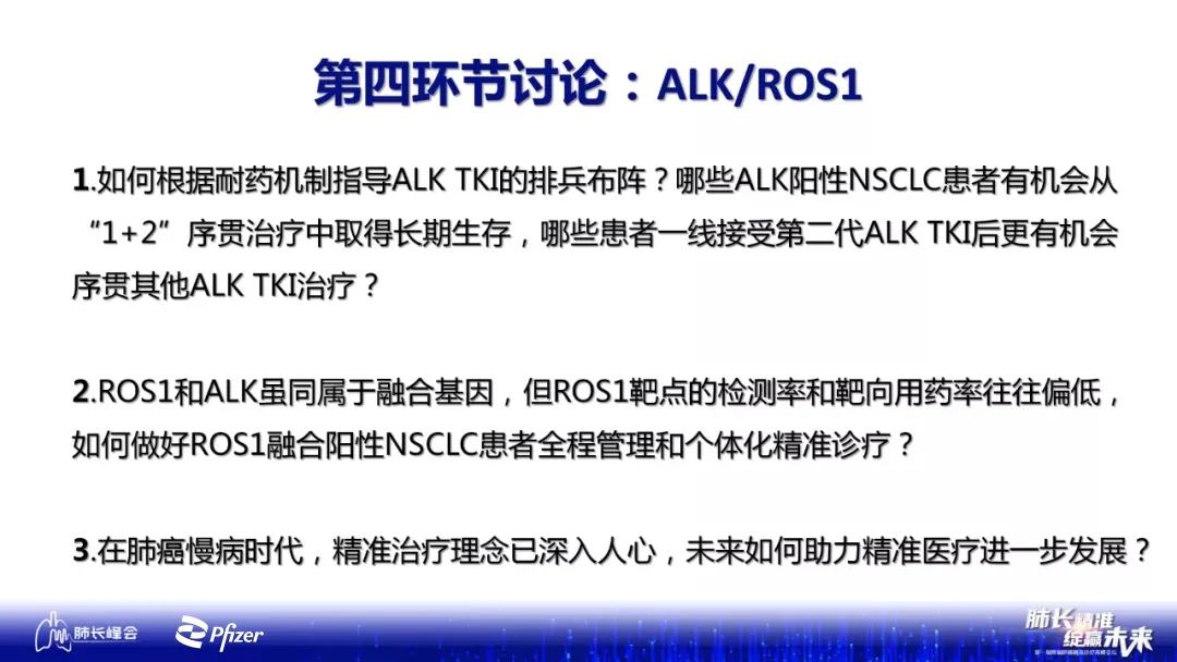 在伍钢教授的主持下,讨论嘉宾分享了依据耐药机制进行ALK TKI排版布阵的临床经验:如果一线治疗选择二代ALK TKI,患者耐药后往往没有太多治疗选择,而且‘1+2’序贯方案已经非常成熟。一线治疗时有脑转移的患者可选择二代ALK TKI起始治疗。