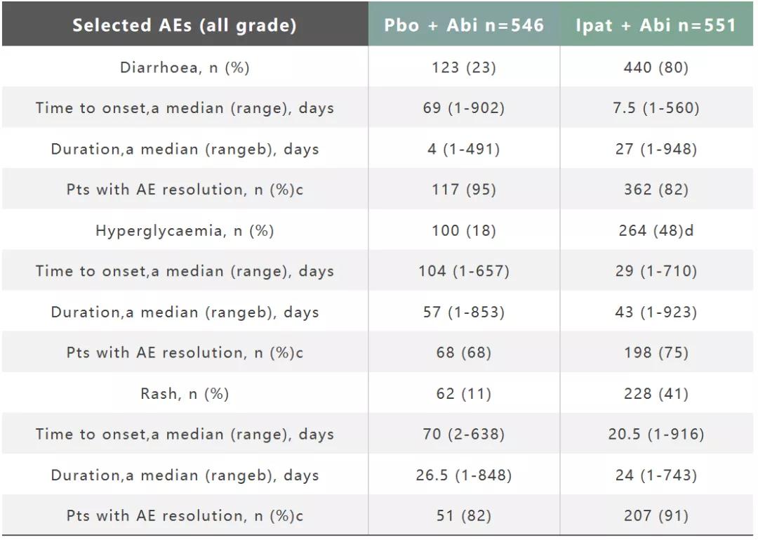 pbo+abi最常见的不良事件是乏力和腹泻(≥20%,n=546),ipat+abi则是腹泻、高血糖和皮疹(≥40%,n=551)。pbo+abi的停药率为5%(腹泻为0,皮疹1%),ipat+abi的停药率为21%(腹泻4%;皮疹3%)。