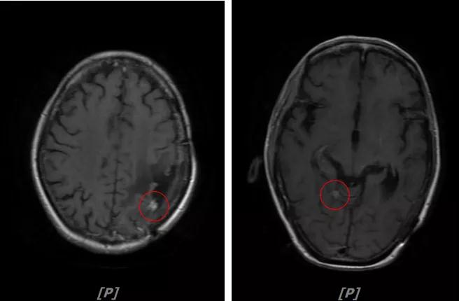 左顶叶强化结节、右侧颞叶-丘脑区结节影:较前片增大