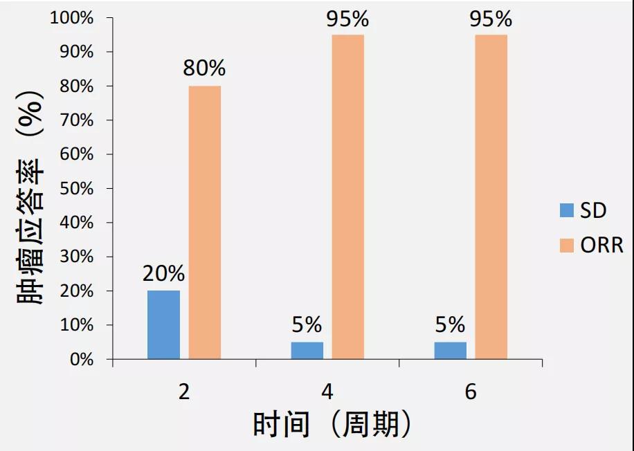 研究结果:计划入组39例,截至2021年4月共入组25例患者,疾病分期17例Ⅱ期、8例Ⅲ期。截至2021年8月,21例患者在新辅助治疗完成后接受了手术,81%(17/21)的患者达到tpCR;在第2、4、6周期结束时,ORR分别为80%、95%和95%。安全性方面,最常见≥3级的治疗相关不良反应是白细胞减少(60%)、中性粒细胞减少(40%)和贫血(16%),安全可控。