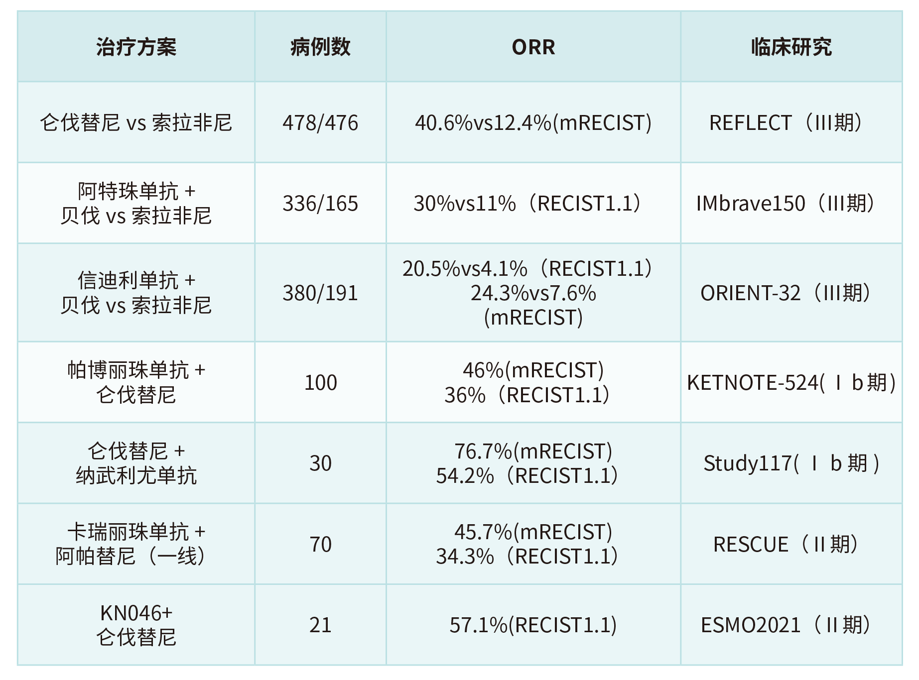 在KEYNOTE-524和Study-117研究中,仑伐替尼+帕博利珠单抗和仑伐替尼+纳武利尤单抗治疗晚期HCC分别可获得46.3%和76.7%的ORR(mRECIST)。国内的一项2期研究则探讨了KN046(一种PD-L1/CTLA-4双特异性抗体)联合仑伐替尼治疗不切切除或转移性HCC的疗效和安全性,结果显示联合治疗的ORR(RECIST 1.1)高达57.1%(KEYNOTE-524和Study-117研究根据RECIST 1.1评估的ORR则分别为36%和54.2%)。