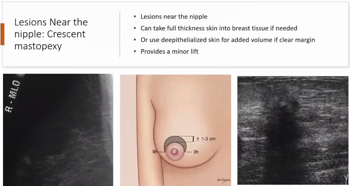对临近乳头位置的肿物,可考虑行新月形皮肤皮下组织缝合(Crescent mastopexy),从而上提乳头乳晕的操作(见图4),从而更好地暴露肿瘤组织并切除,且术后乳房整体外表美观,但有着乳头内陷、双侧乳房不对称的缺点,因此可考虑对双乳均进行上提。