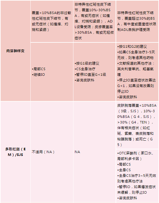 根据不同的斑丘疹cirAEs分级(轻、中、重度),可给予以下不同的处理。