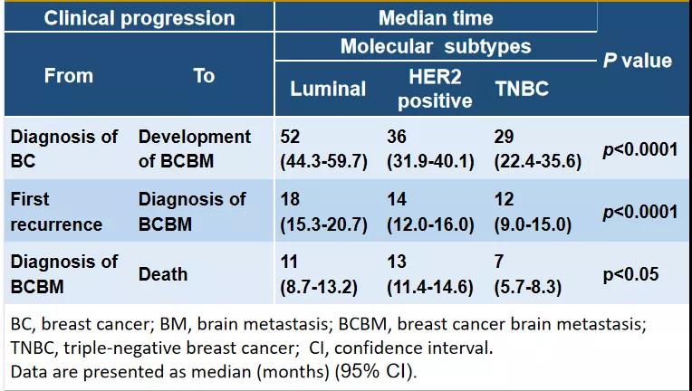当前乳腺癌已经进入到分子分型时代,我们可以将其分为Lumianl(A/B)型乳腺癌、HER2阳性乳腺癌和三阴性乳腺癌。这几类乳腺癌的脑转移发生发展规律也是有所不同的,从当前的数据来看,Luminal型患者确诊乳腺癌至诊断脑转移时间明显长于HER2阳性和三阴性。