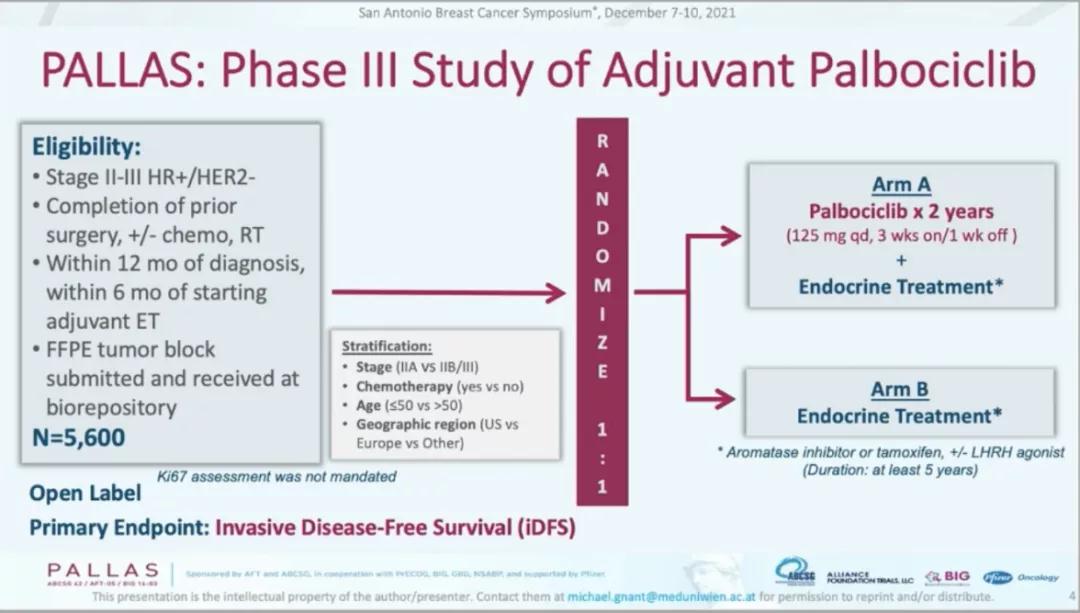 ■ 研究设计:PALLAS研究(NCT02513394)是一项在全球21个国家406个中心开展的随机(1∶1)、开放标签的Ⅲ期临床试验,旨在评估Palbociclib+ET治疗对比单纯ET对早期(Ⅱ、Ⅲ期)HR+/HER2-乳腺癌辅助治疗的疗效和安全性。Palbociclib+ET组接受Palbociclib(2年)+ET辅助治疗;单纯ET组则仅接受ET辅助治疗。主要研究终点为无侵袭性疾病生存(iDFS),次要终点包括无乳腺癌复发生存(iBCFS)、无远处复发生存(DRFS)、无局部复发生存(LRFS)、总生存(OS)和安全性。同时,该研究还基于转化医学的理念进行生物样本收集从基因层面探索了疗效相关生物标志物。