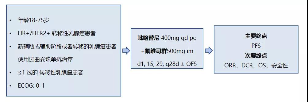 这是一项单中心、单臂、开放标签II期研究(NCT04034589),纳入患者为:HR+/HER2+转移性乳腺癌患者,年龄18-75岁,(新)辅助或转移性疾病治疗曾使用过曲妥珠单抗;既往治疗≤1线,ECOG为0-1;所有患者给予吡咯替尼(400mg qd po)+氟维司群(500mg im d1,15,29,q28d)±OFS治疗。