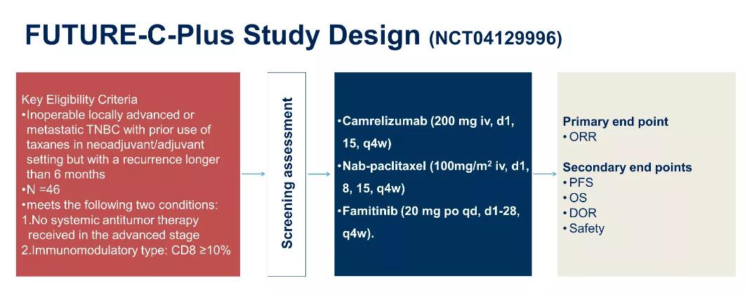 研究题目:Updated data from FUTURE-C-PLUS: combination of famitinib with camrelizumab plus nab-paclitaxel as first-line treatment for advanced, immunomodulatory triple-negative breast cancer, an open-label, single-arm, phase 2 trial