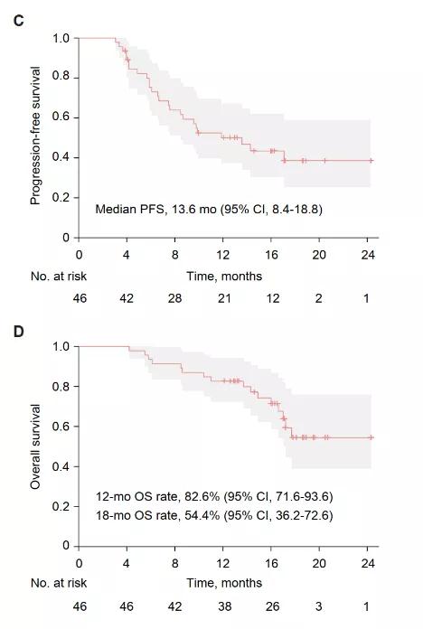 本次更新数据截止时间为2021年10月12日,中位随访时间为17.0个月,中位PFS为13.6个月(95% CI:8.4~18.8个月),12个月的OS率为82.6%(95% CI:71.6~93.6),18个月的OS率为54.4%(95% CI:36.2~72.6)。