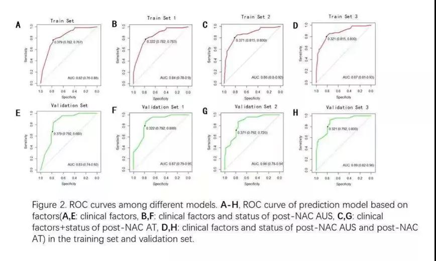 基于上述数据的临床模型得出的训练集中曲线下面积(AUC)为0.82(95% CI:0.76~0.88),验证集中AUC为0.83(95% CI:0.74~0.92)。