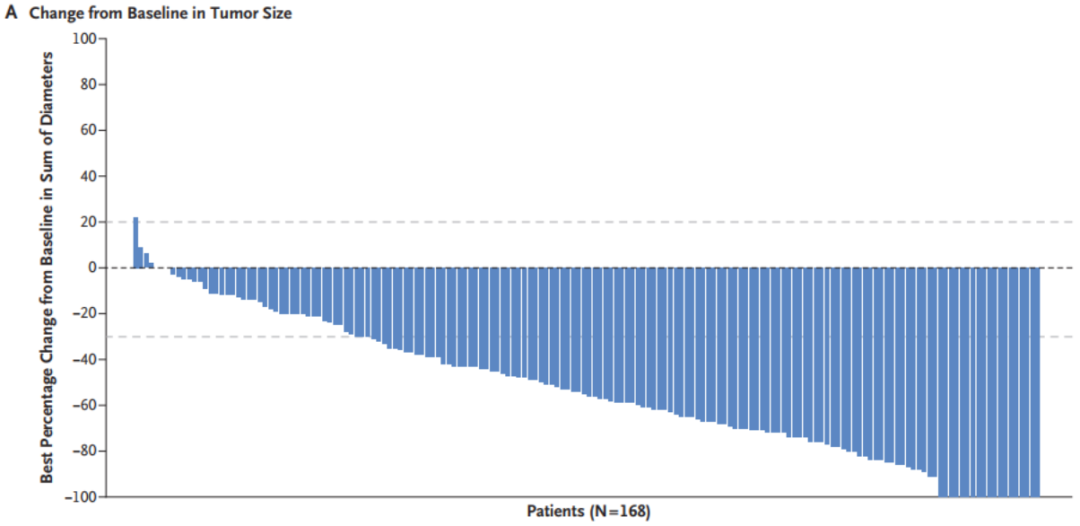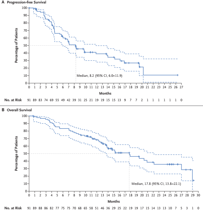 在2021年9月,DESTINY-Lung01研究的结果也在NEJM进行了发表,这是一项国际多中心Ⅱ期研究,评估了T-Dxd用于标准治疗后难治转移的HER2突变NSCLC患者。结果显示,T-Dxd在既往经治的HER2突变NSCLC患者中显示出持久的抗癌活性。该研究共纳入91例患者,中位随访时间为13.1个月。ORR为55%,中位缓解持续时间为9.3个月(95%CI:5.7~14.7),中位无进展生存期为8.2个月(95%CI:6.0~11.9),中位总生存期为17.8个月(95%CI:13.8~22.1)。