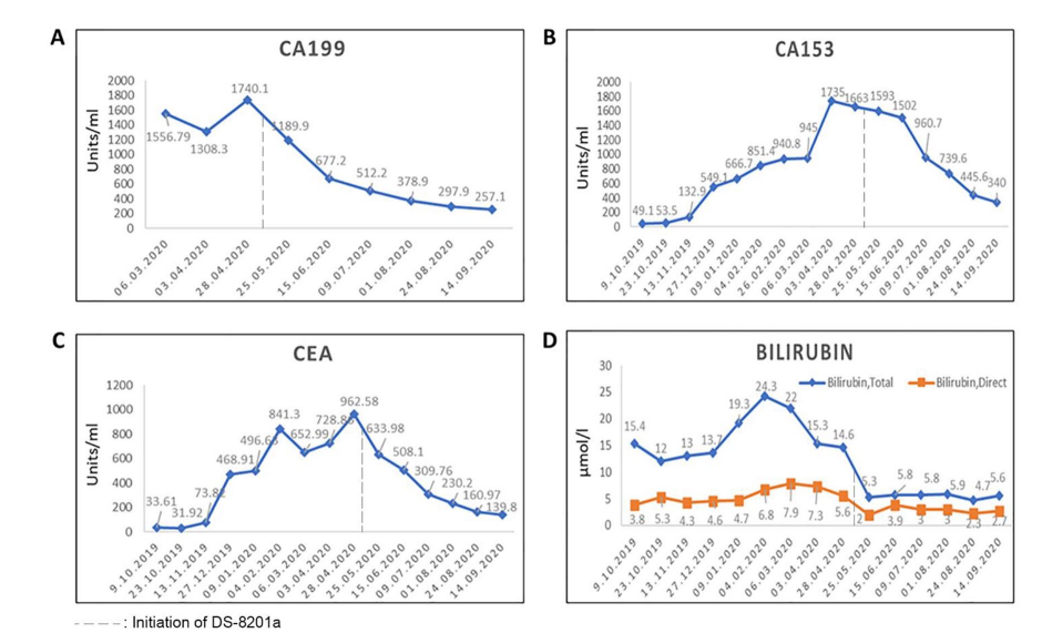 CA153、CEA和CA199的肿瘤标志物水平分别从1735降至340 ng/mL、从962.58降至139.8 ng/mL和从1740降至257.1 ng/mL(图2)。肝功能也得到改善,总胆红素为5.6?mol/L,直接胆红素为2.7?mol/L。DS-8201治疗组患者报告轻度不良事件(1级呕吐和疲乏)。