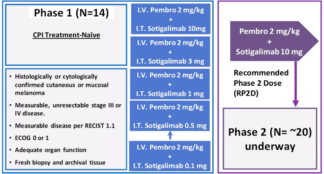 本次大会上报道的这项正在进行的I/II期研究,评估了APX005M瘤体内注射联合帕博利珠单抗全身治疗用于未经CPI治疗、无法切除的III期或IV期的黑色素瘤患者。共入组30名患者,患者每3周接受一次sotigalimab瘤内注射,共4剂。该试验的剂量递增部分已经完成,14名患者被纳入5个sotigalimab剂量组(0.1、0.5、1、3和10 mg)。主要终点包括安全性和耐受性,确定推荐2期剂量(RP2D),以及根据RECIST v1.1评估总体缓解率(ORR)。