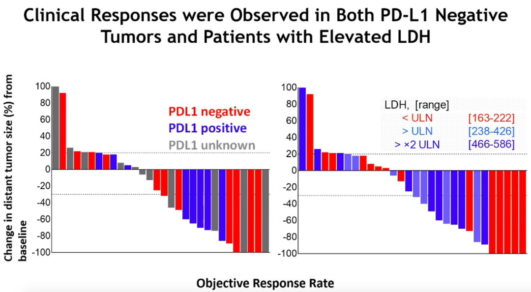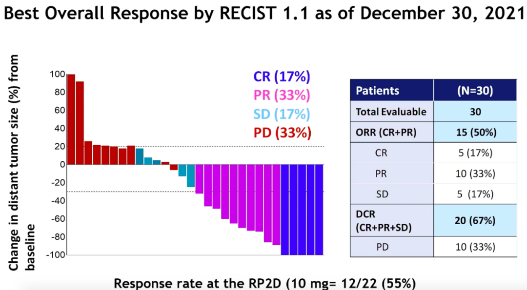 结果显示:联合治疗耐受性良好,没有因治疗相关不良事件(TRAE)而导致研究中断或死亡。最常见的TRAE是注射部位反应;6例患者发生3级免疫相关不良事件。对30例患者进行基线后疾病评估的疗效分析表明,非瘤体注射的远隔病灶的ORR为50%(5例CR和10例PR),疾病控制率(DCR)为67%。10 mg( 被确定为RP2D)剂量组的ORR为55%(12/22)。在PD-L1阴性患者和LDH升高患者中能观察到治疗反应。