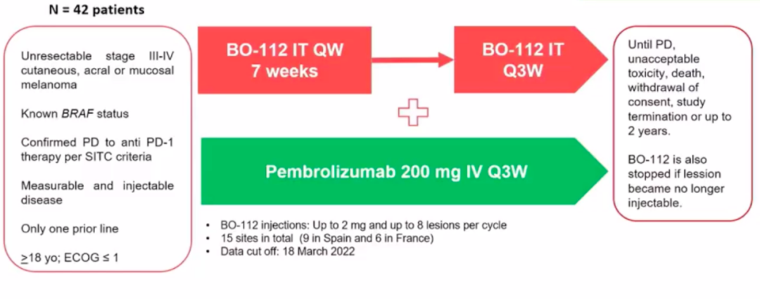 本次会议报道的是II期研究结果,这项单臂研究入组的是既往PD-1单抗耐药的黑色素瘤患者,给予瘤体内注射BO-112联合静脉注射帕博利珠单抗,患者每周使用1-2mg的BO-112治疗,共7周;之后每3周对1-8个不同的病灶进行治疗。帕博利珠单抗为200mg Q3W给药。主要终点是总体缓解率(ORR),至少20%的患者必须达到缓解,才能满足主要终点。