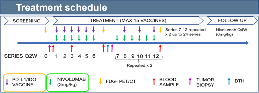 这是一项由研究者发起的I/II期研究(NCT03047928)中,入组对象为未经抗PD-1治疗的IV期黑色素瘤患者,给予最多15剂IDO/PD-L1肽疫苗皮下注射(6x q2w,随后9x q4w)。纳武利尤单抗(3 mg/kg)每2周给药一次(q2w),最长持续两年。评估临床疗效、毒性和生存数据。