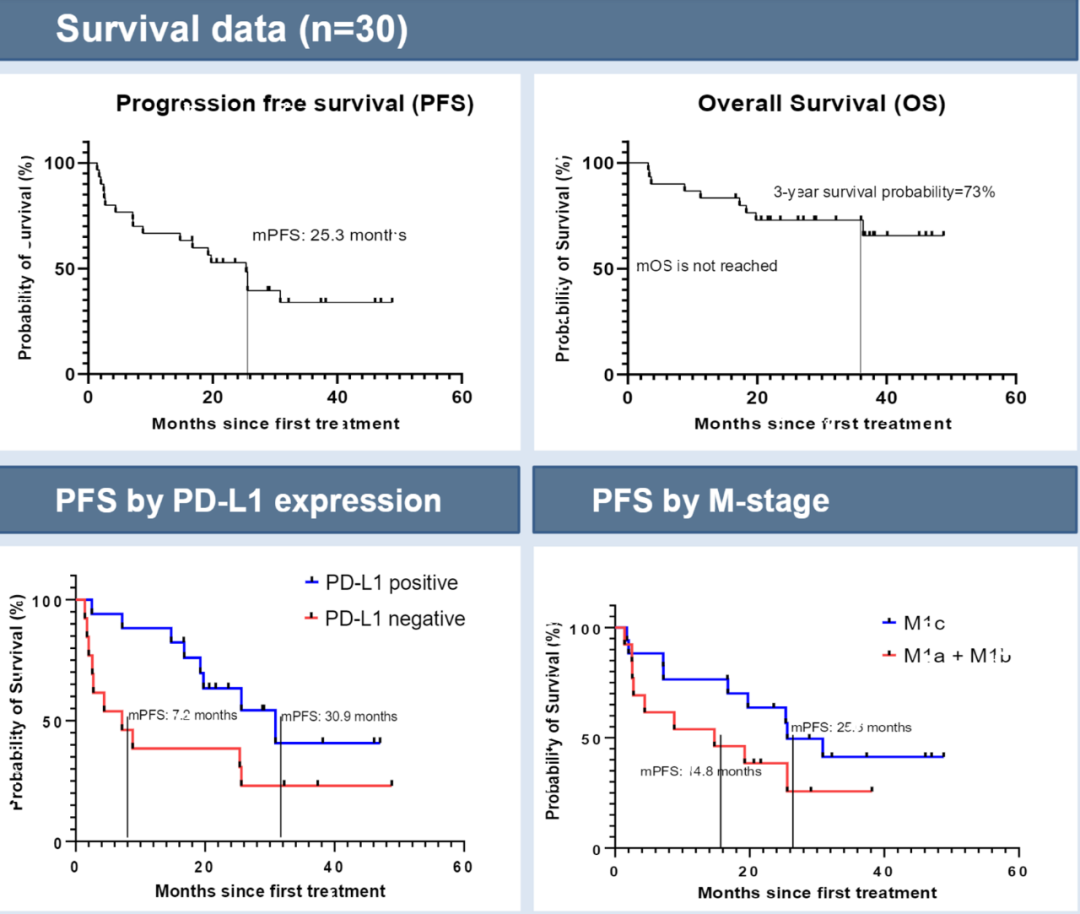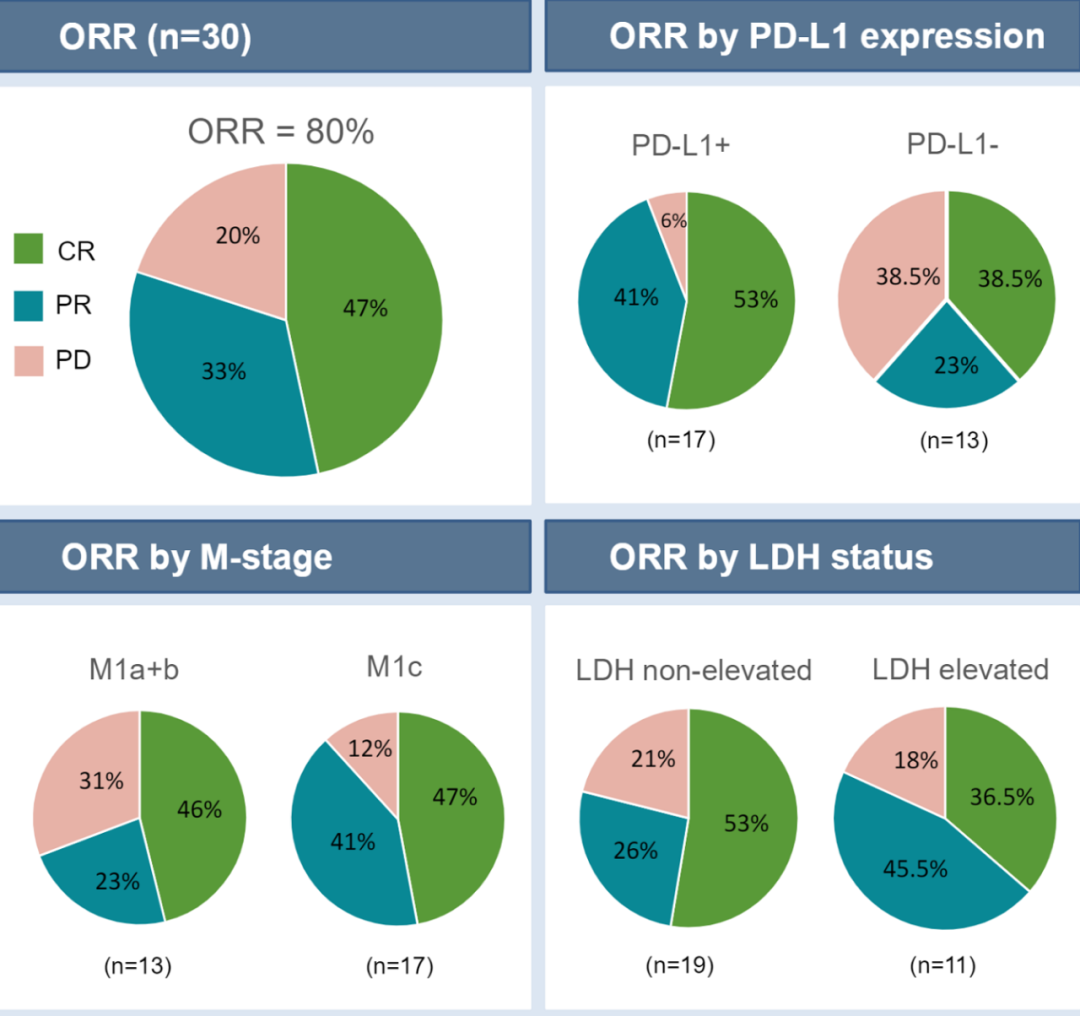 截至2021年12月1日,所有30例患者在完成IDO/PD-L1接种计划联合纳武利尤单抗后进行评估。ORR为80%(n=24),CR率为46.7%(n=14)。中位随访2.7年后,mPFS为25.3个月;mOS未达到,3年OS率为73%。亚组分析显示,在PD-L1+患者有效率(RR)为94.1%,mPFS为30.9个月。PD-L1-患者RR为61.5%,mPFS为7.2个月。此外,基线LDH水平升高的预后不良患者中,RR为81.8%,mPFS为30.9个月。基线LDH水平未升高的患者中,RR为78.9%,mPFS为19.3个月。基线M1c期患者的RR为88.2%,mPFS为25.6个月,而基线M1a或M1b患者的RR为69.2%,mPFS为14.8个月。免疫相关不良事件与接受纳武利尤单抗单药疗法的患者相当,在预后不良的患者中未观察到未预期的毒性。