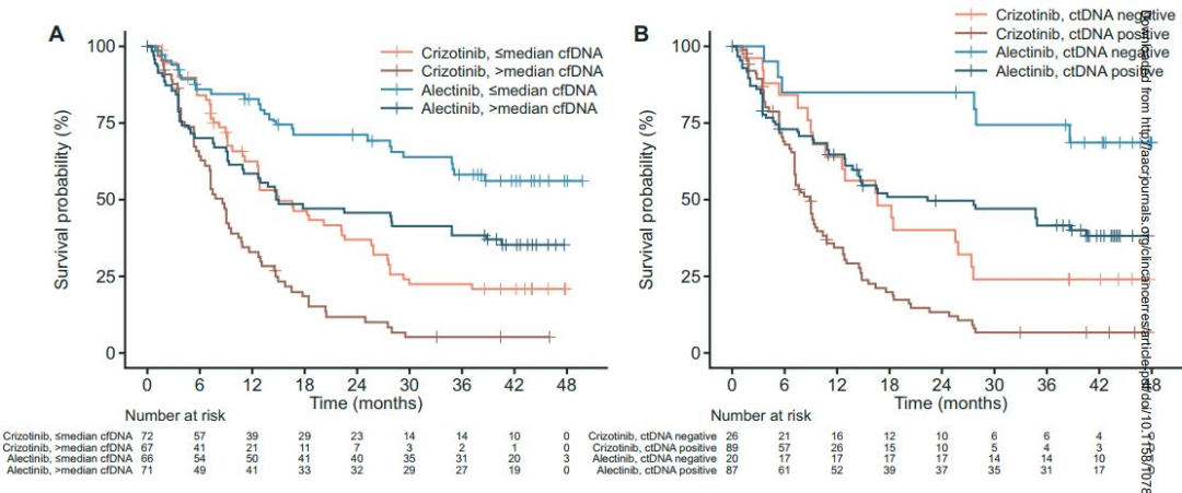 ALEX研究是一项全球、随机对照临床研究,符合入组标准的患者接受阿来替尼600mg,口服,每日两次;或克唑替尼,250mg,口服,每日两次的治疗。最终,两组分别入组152例和151例患者,cf-DNA于基线进行定量检测并基于平均水平分为两组,通过Cox模型计算cf-DNA定量和患者预后的关系。