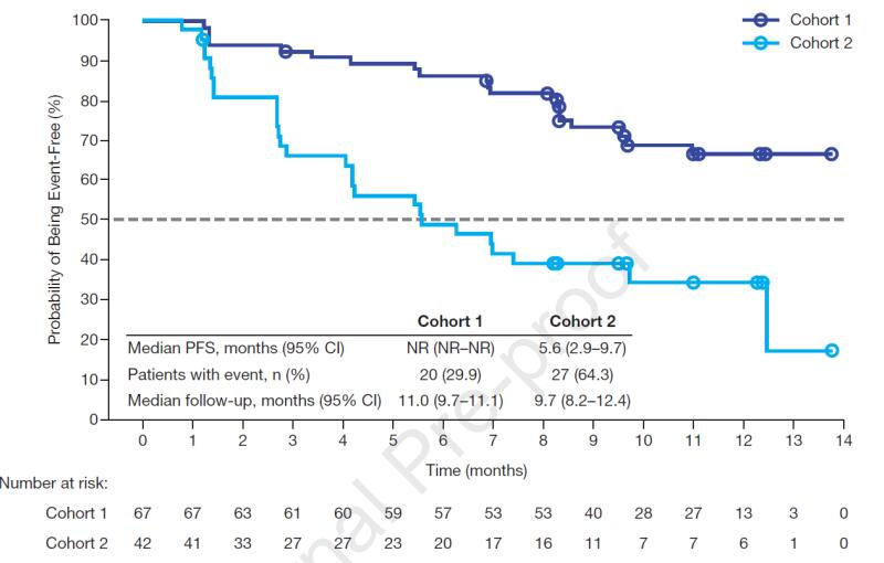 至数据截止时,队列1和队列2分别入组67例和42例患者,ORR分别为70.1%和47.6%,中位PFS分别为未达到和5.6个月。队列1中,36例基线有脑转移的患者,ORR为80.6%;队列2中,21例基线有脑转移的患者,ORR为47.6%。最常见的治疗相关不良反应为胆固醇升高(92.7%)以及高甘油三酯血症(90.8%),8.3%的患者出现治疗相关的严重不良反应,1例患者因此终止治疗。