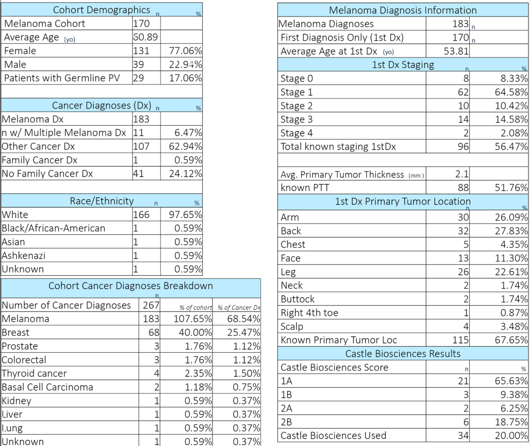 方法:这是一项经IRB批准的多中心纵向观察性研究,患者数据来自于iGAP(Informed Genetically Annotated Patient)登记处,旨在获取患者的基因检测结果和疗效、生存信息。研究选取单个肿瘤外科医生接诊的一系列未经选择的黑色素瘤患者,均接受基因检测。此外,因其他原因(乳腺癌)已经接受基因检测的患者也纳入此研究。研究队列分为两个亚组:有乳腺癌病史的黑色素瘤患者和从未患过乳腺癌的黑色素瘤患者。收集的人口特征包括诊断时年龄、种族、其他癌症、黑色素瘤分期和黑色素瘤厚度。