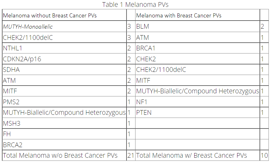 共有29名患者(17.06%)携带1种PV(1名同时患黑色素瘤和乳腺癌的患者携带有3种PV)。下表和下图列出了患者携带的不同PV基因。在同时患有黑色素瘤和乳腺癌的患者(n=56)中,有8名(14.3%)携带PV。在无乳腺癌病史的黑色素瘤患者(n=114)中,有21例(17.5%)携带PV。