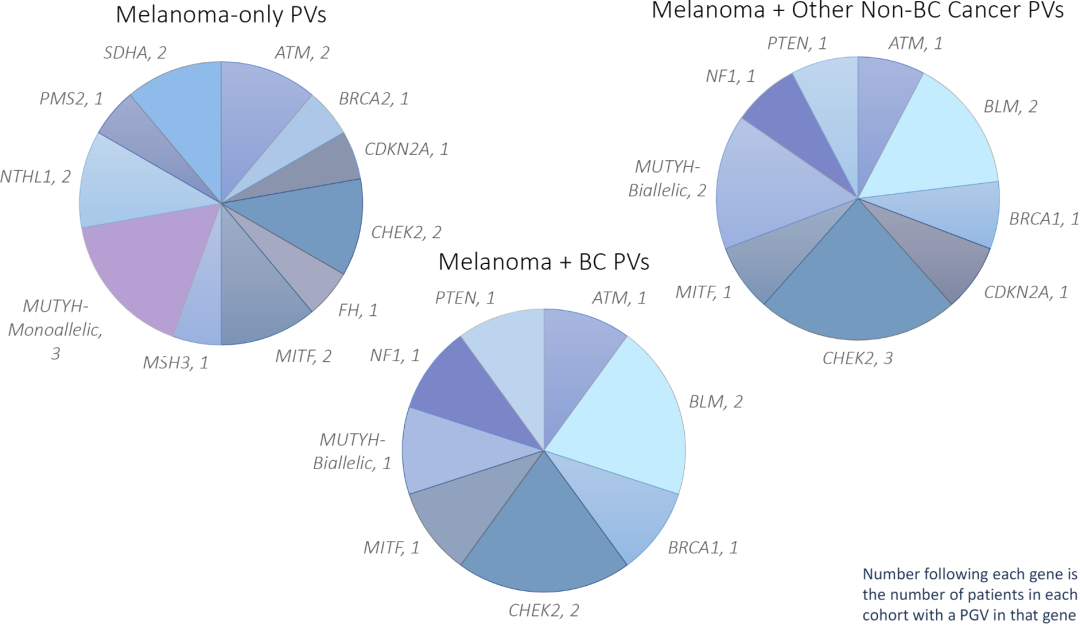 结论:随着胚系基因检测的成本大幅下降,更多的肿瘤患者可以进行这样的检测。曾有学者尝试为黑色素瘤患者确定胚系检测的指征,但结果并不统一。本研究队列显示黑色素瘤患者(合并或不合并乳腺癌)携带PV的发生率为17%,提示黑色素瘤患者应接受胚系突变检测。