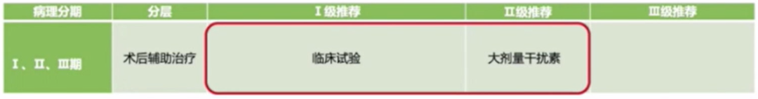 IIB、IIC期患者可I级推荐高剂量干扰素a-2b×4周或1年或临床试验;IIC期携带BRAF V600突变的患者可II级推荐维莫非尼1年;III期患者可I级推荐高剂量干扰素a-2b×4周或1年;