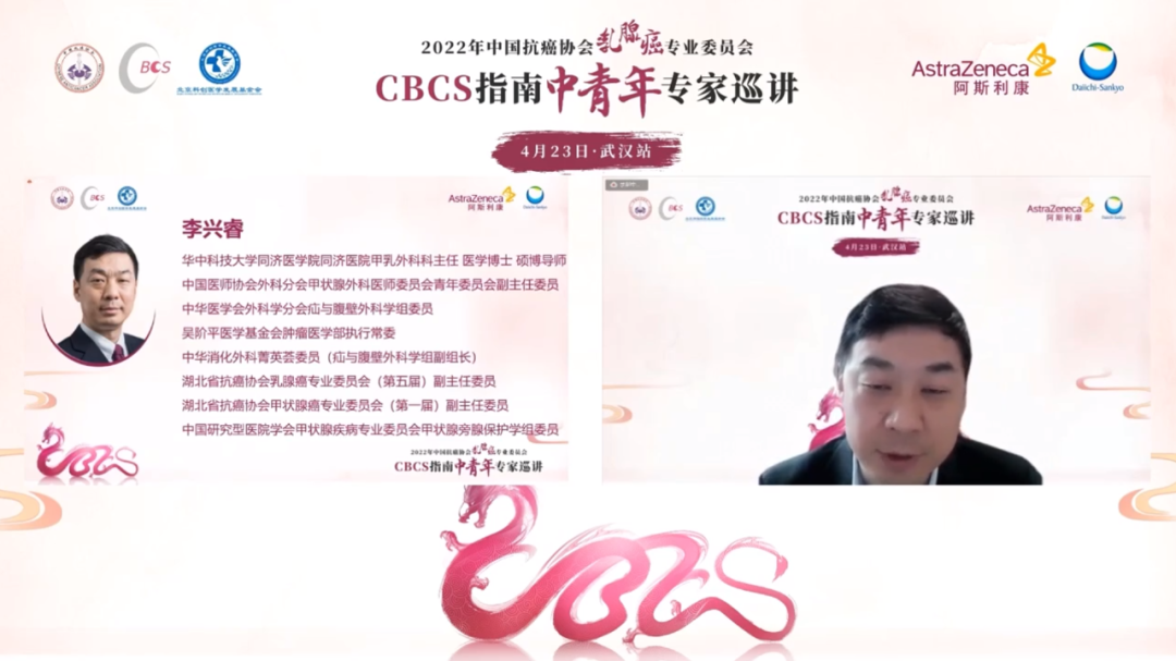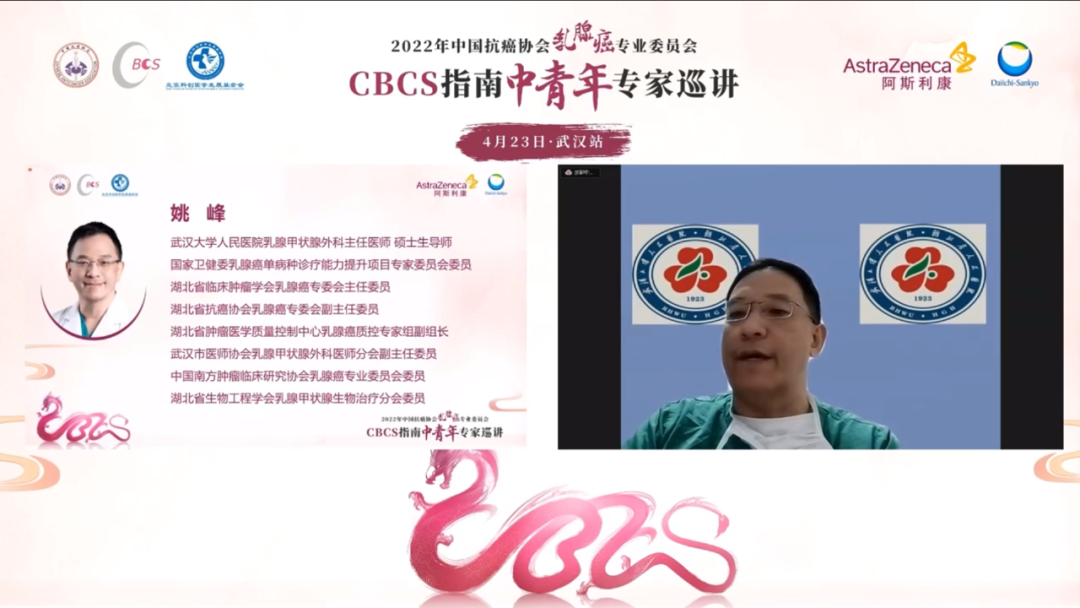 编者按:2022年中国抗癌协会乳腺癌专业委员会CBCS指南中青年专家巡讲——武汉站于4月23日圆满落幕。本次会议由中国抗癌协会乳腺癌专业委员会、北京科创医学发展基金会主办,华中科技大学同济医学院附属协和医院承办。在名誉主席黄韬教授、程晶教授,飞行主席郝春芳教授和云端主席余科达教授,特邀主席吴新红教授、李兴睿教授、姚峰教授,执行主席赵艳霞教授组成的大会主席团带领下,上半场与会专家就CBCS指南内容进行了解读和讨论,下半场各位专家学者就各亚型乳腺癌患者的治疗进行了病例讨论与分享。