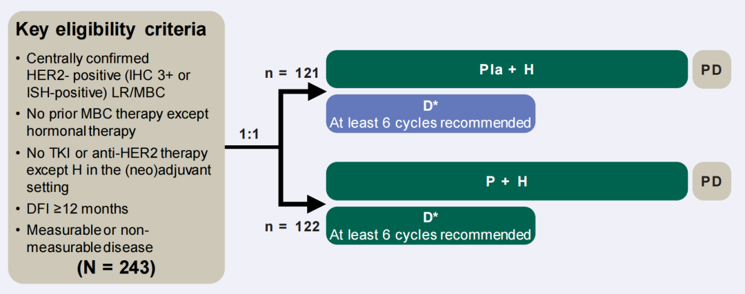 方法:将未经治疗的HER2阳性LR/MBC患者按1:1(按内脏疾病和激素受体状态分层)随机分为PHD组或安慰剂组(Pla+HD)。主要终点是研究者评估的PFS。次要终点包括安全性和OS。初步分析后,允许患者从安慰剂组交叉至PHD组。