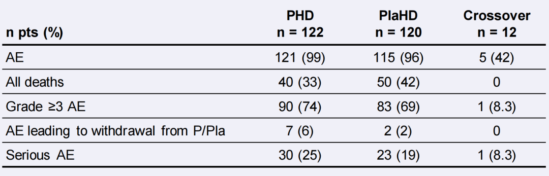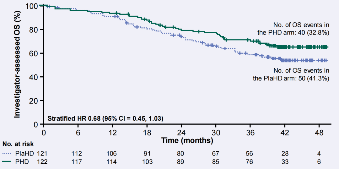 如下图所示,PHD组和安慰剂组的中位PFS分别为16.5个月和12.5个月,双靶治疗组的疾病进展或死亡风险下降40%(HR 0.60,95%CI:0.45~0.81);死亡风险降低32%(HR 0.68,95%CI:0.45~1.03)。