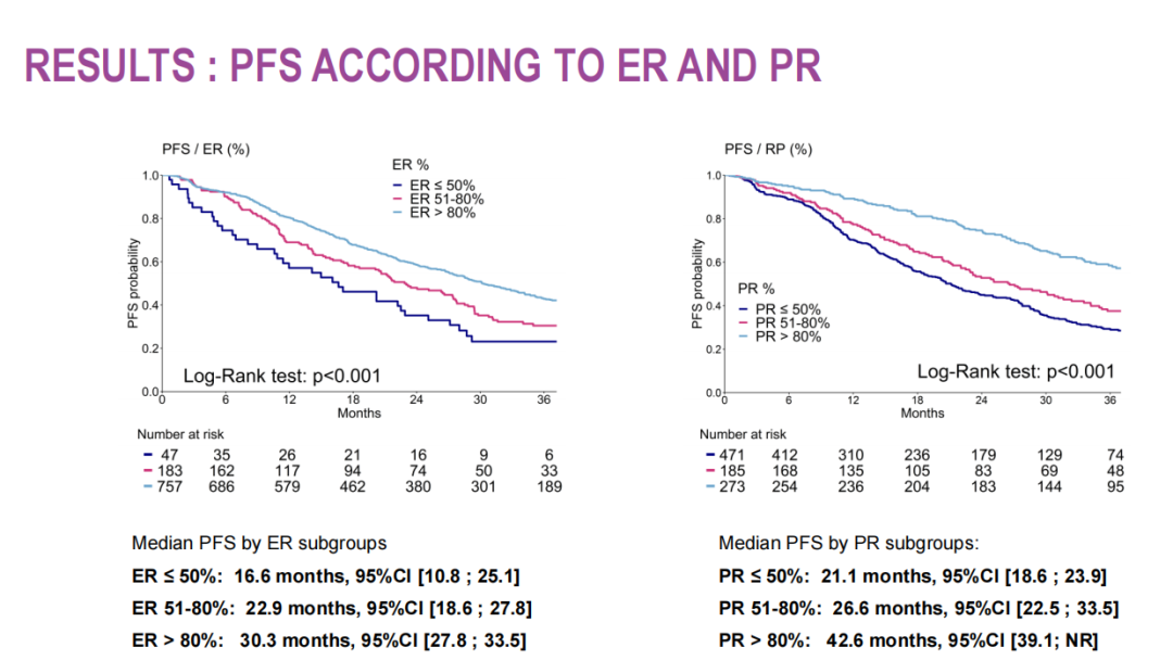 在单变量分析中,中位随访28.1个月后,有527次PFS事件(51.8%)发生,其中ER表达水平在[0~50%]、[51~80%]和[81~100%]的患者的mPFS分别为分别为16.6个月、22.9个月和30.3个月。PR表达水平在[0~50%]、[51~80%]和[81~100%] 患者的mPFS分别为 21.1个月、26.6个月和42.6个月。