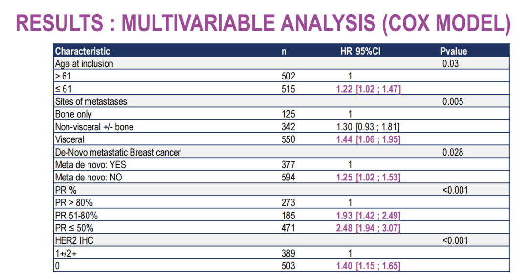 在我们看来,ER、PR表达水平越高必然对内分泌治疗越敏感,但研究者本着更加严谨认真的科研态度,用更直观、更数据化的结论为我们展示了这一观点。通过研究者的对比分析我们可以看到,ER、PR水平的表达越高,预示着一线使用PAL+AI效果越好,是影响PFS的独立因素。研究结论中提及“对于ER<50%的患者中,使用哌柏西利联合AI仍旧可以获得的 16.6个月绝对mPFS获益,这表明CDK4/6i+AI仍然是该患者群体的良好治疗选择。”但是我们可以看到对于<50%这一区间还是很广泛,ER表达10%对比ER表达45%,必然对于PFS的影响是不同的。因此,我们也希望通过后续的探索能够给到一个合适的ER、PR表达水平的cut-off值,以用于指导我们挑选更适合的使用CDK4/6抑制剂联合AI的人群,为精准化治疗指引方向。