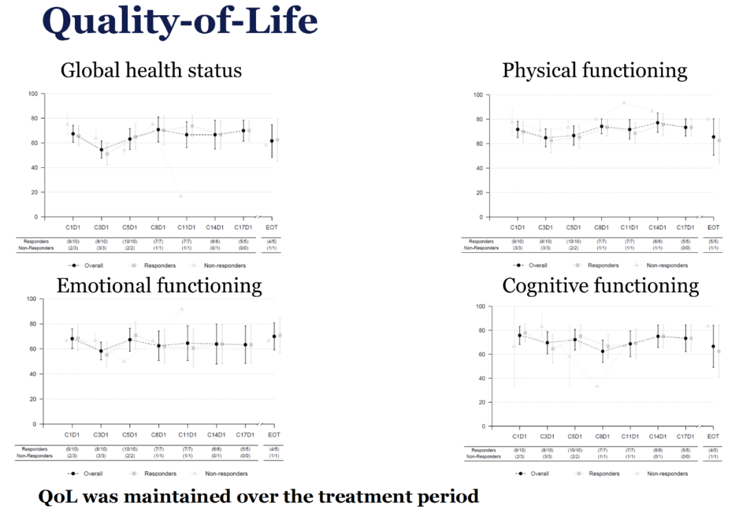 1/2级贫血和中性粒细胞减少发生率均为46.6%;主要的1/2级非血液学毒性包括疲劳(66.7%)、恶心(46.7%)和腹泻(33.4%)。9例患者发生过剂量减少;4例患者出现严重不良事件。有1例患者发生2级间质性肺病(ILD),1例患者发生3级左室射血分数下降。治疗期间,患者能够维持相应的生活质量(包括全球健康状态、躯体功能、情绪功能、认知功能)。
