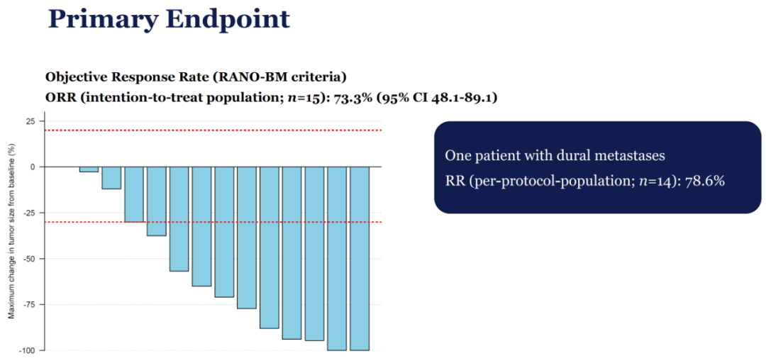 有1例最初被评估为有实质性BM的患者,再住院时发现有硬脑膜转移而被排除在疗效分析之外。在意向性治疗(ITT)人群中,颅内RR为73.3%(11/15),临床获益率(CBR,CR+PR+SD≥6个月)为86.7%(13/15);符合方案(PP)人群的RR为78.6%(11/14),CBR为92.9%(13/14)。中位随访11个月时,中位PFS为14个月(95%CI:8.48~19.52);2例患者死于疾病进展;中位OS尚未达到。在基线有颅外转移的患者中,部分缓解(PR)率为27.8%(5/13);在基线有可测量颅外转移疾病的患者中,PR率为62.5%(5/8)。